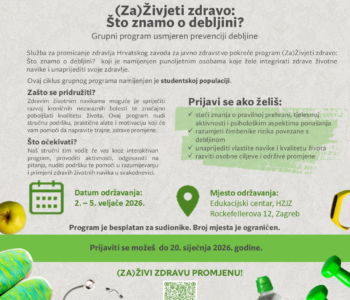 (Za)Živjeti zdravo: Što znamo o debljini? Grupni program usmjeren prevenciji debljine Služba za promicanje zdravlja Hrvatskog zavoda za javno zdravstvo pokreće program (Za)Živjeti zdravo: Što znamo o debljini? koji je namijenjen punoljetnim osobama Više…